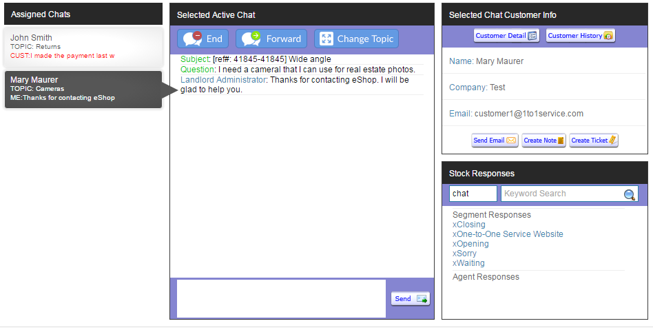 Agents can interact with more than one website visitor at a time. When the agent has more than one live chat assigned, they will only see one "active" chat window at a time. The other chat windows will be minimized and shown to the left of the active chat window. To switch between chat windows, click on the desired chat summary to the left.