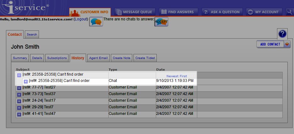 When a chat is resolved, the complete history is archived into the iService database. You can view this history from the contact's Customer Info - History tab. The customer can also view this history from their My Account - History tab.