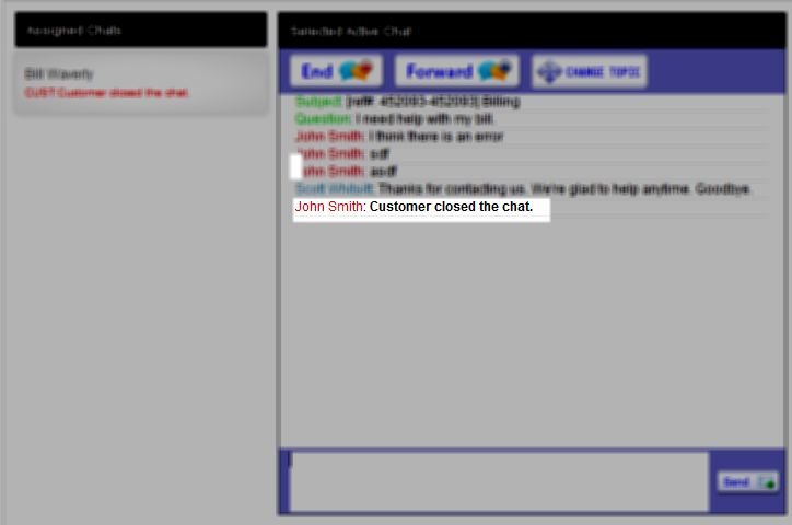 Close Button - The customer can end the chat by clicking the close button. The chat window will remain open, but text indicating the customer has closed the chat is posted into the dialogue. The agent will see this text for 10 seconds before their chat window is automatically closed, as shown below.
