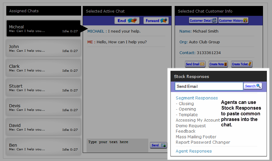 iService chat provides direct access to the Segment and Agent stock responses created as part of the overall iService installation. To paste a stock response into your chat edit window, select the response and click it's name.