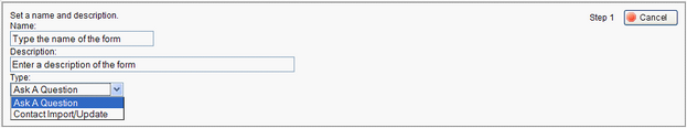 The forms wizard can create two types of forms: ask a question and contact import. Select Contact Import/Update to create a form that creates new contacts in iService.
