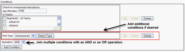 The second step when creating an alert is to specify the conditions in which the actions will apply. Clicking the Add Condition button allows an additional condition to be added via an AND or an OR; however, in release 4.12, the only condition is unanswered interaction, so adding additional conditions through this mechanism is currently not useful.