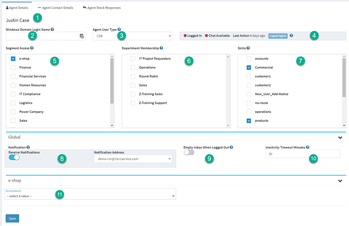 4 - Agent Status – This panel shows whether the agent is logged in, whether they're available for chat, and the last date/time they completed an activity. Agent activity is defined as use of any iService web service (loading any page will use a web service). Agents can be logged out by an administrator via the Logout Agent button. Any unsaved information Created by the agent will be lost when the agent is logged out by an administrator.