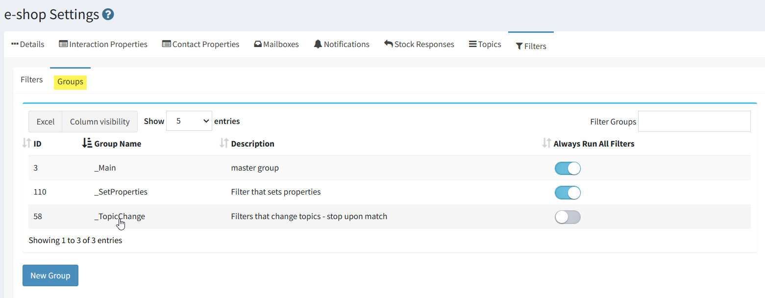 Since mailboxes and topics can only have one filter assigned, groups can be used to combine multiple filters. To create a filter group, click New Filter Group and enter a name for the filter group. Then drag and drop the filters to be included within the group from the Available Filters box.