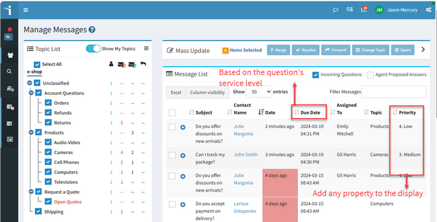 Use the Column Visibility button to select the columns to display. You can include any interaction property, like Priority, as a column in the message list. A special value, Due Date, can also be added to your view. The Due date is the creation time of the question plus the lowest service level to that is relevant for the question.