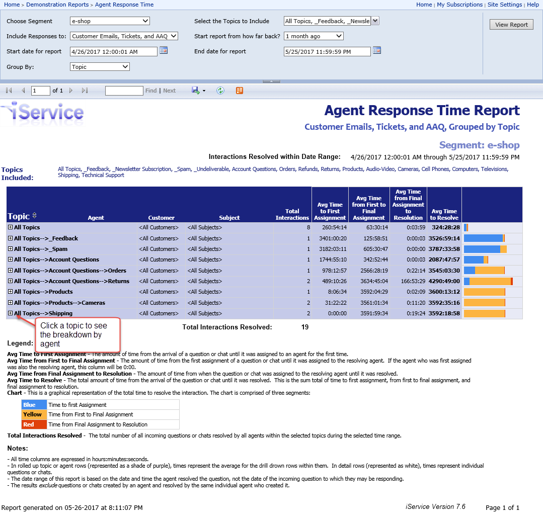 The agent response time report shows a breakdown of the time required to resolve interactions. It can be run for messages (Customer e-mails, tickets, and AAQ forms) or chats, and can group by agents or topics. It provides insight into how long it takes to get messages assigned agents, and how long agents take to provide the response.